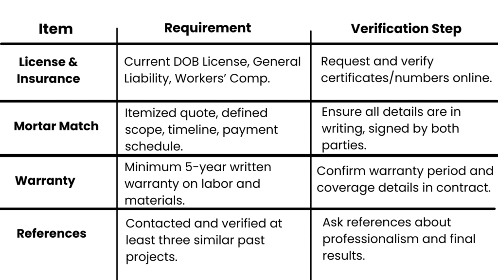 - DOB Licensed Contractor Status: The contractor must be actively licensed with the NYC Department of Buildings. Ask for their license number and verify its status directly on the DOB website. This confirms they meet the basic requirements to perform masonry repair nyc.